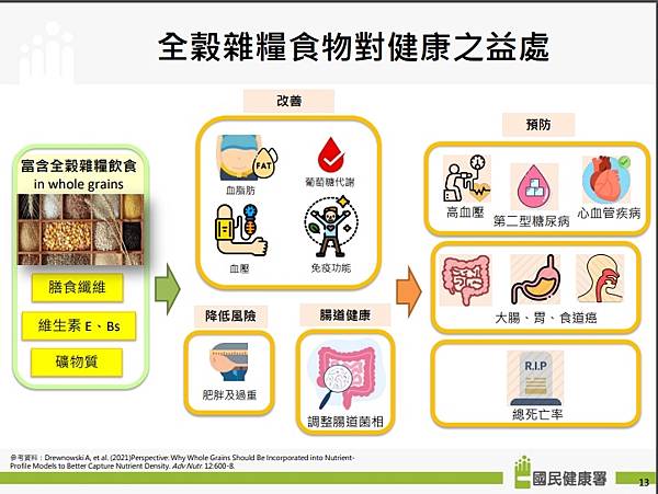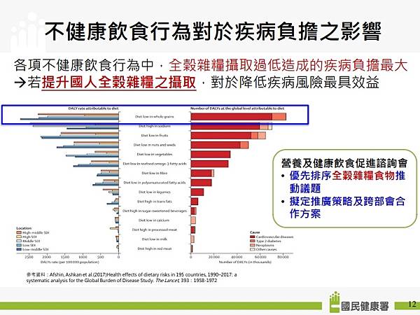 其中不健康飲食行為,屬「全榖雜糧」攝取過低造成的疾病負擔最大。
